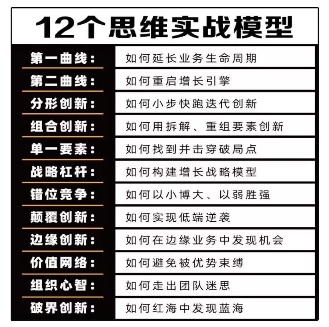 ps:除视频外,小编还推荐阅读此书~ 内容精炼 什么是多元思维模型? 用过去的经验来指导未来,这个经验是具象的。这个经验的边界太窄,不够深入,也没有办法跨领域迁移。但用思想、用逻辑,把过去的经验抽象化为一个思维模式就能更好地认识世界,更好地解释过去并预测未来。而多元思维模式,来自于基础科学的理论基础,通过结合多个学科的知识、不同的维度,来观察事务,分析问题,这样就可以得出比较准确的结论。就是一个人具备十个、几十个思维模型。 创新的三个模型(第一曲线、第二曲线、分形曲线) 第一曲线是创新的元模型,揭示的是自然规律,能够定位当下。 第二曲线是创新的最终目的,为的是获得持续的增长。 分形创新是创新方法论。你在某个整体的布局,从任何一局部挖下去,你看到的新的整体,就叫分形。所以这种创新,通过增加维度的方式实现创新,它也是跨越第一曲线与第二曲线之间非连续性的第一性原理,来源于数学中的分形算法和大自然当中无处不在的分形。 对于任何企业,极限点都是不可避免的,必须在极限点来临之前果断开启第二曲线。所以识别破局点并击穿它就能产生自增长。