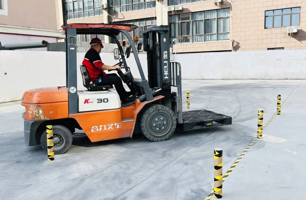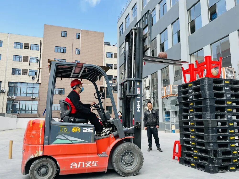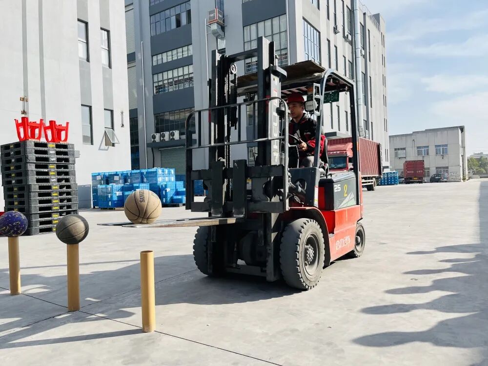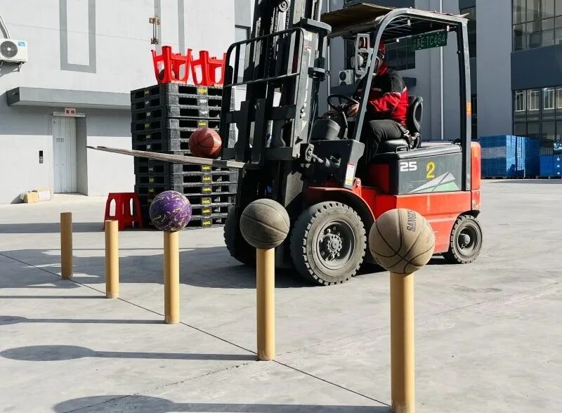 叉车连续走S线障碍叠栈板 正确系安全带、戴安全帽 行驶中不压线、不撞到障碍物 栈板叠放整齐、停车规范... 都是我们的评分标准哦~ 项目三:趣味叉车投篮